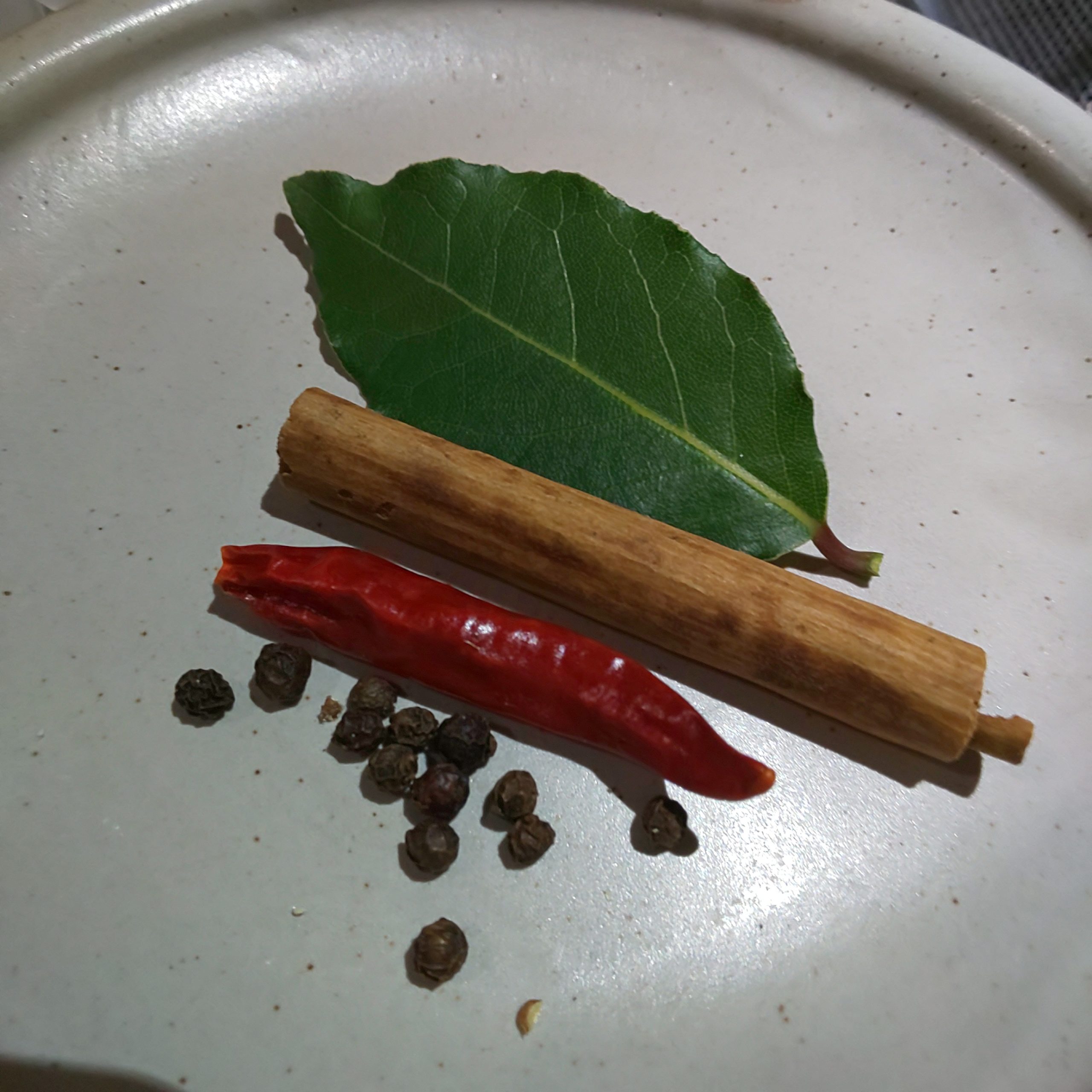 今回は、庭に大きく育ったローリエの葉、鷹の爪(唐辛子)、ブラックペッパーホール