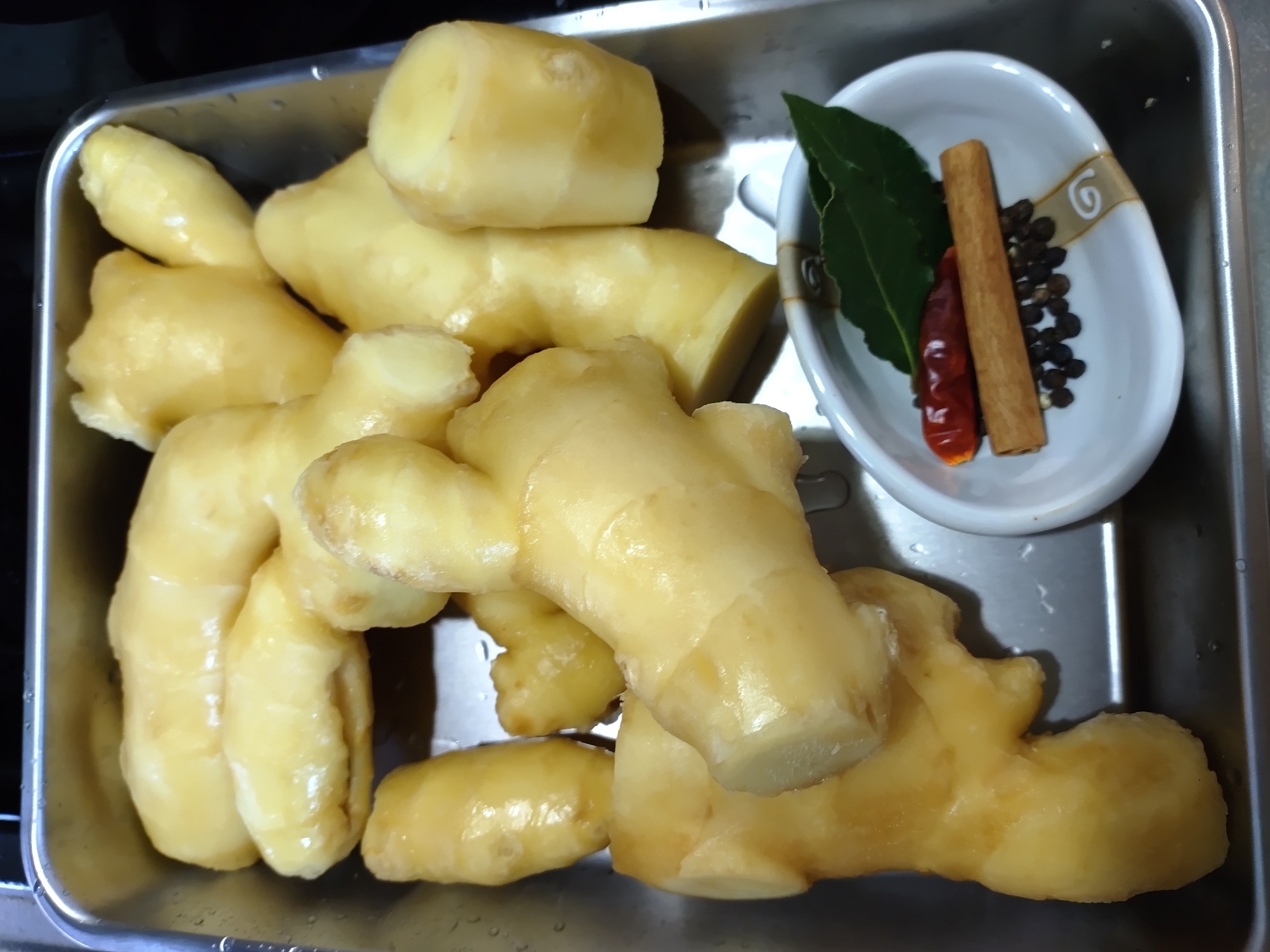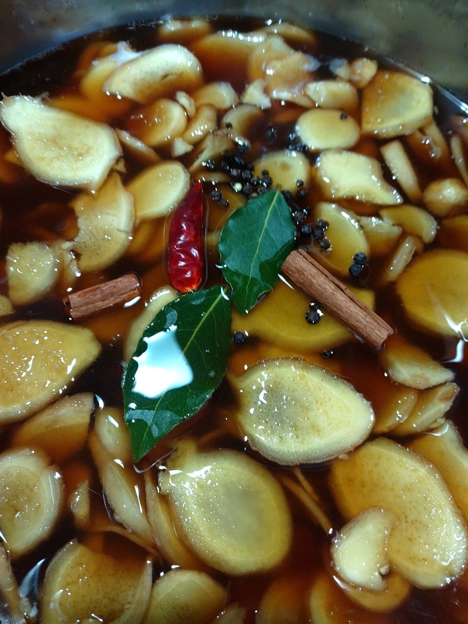 スライスした生姜にきび砂糖と黒糖をまぶしてから水とスパイスを入れて煮込みますが